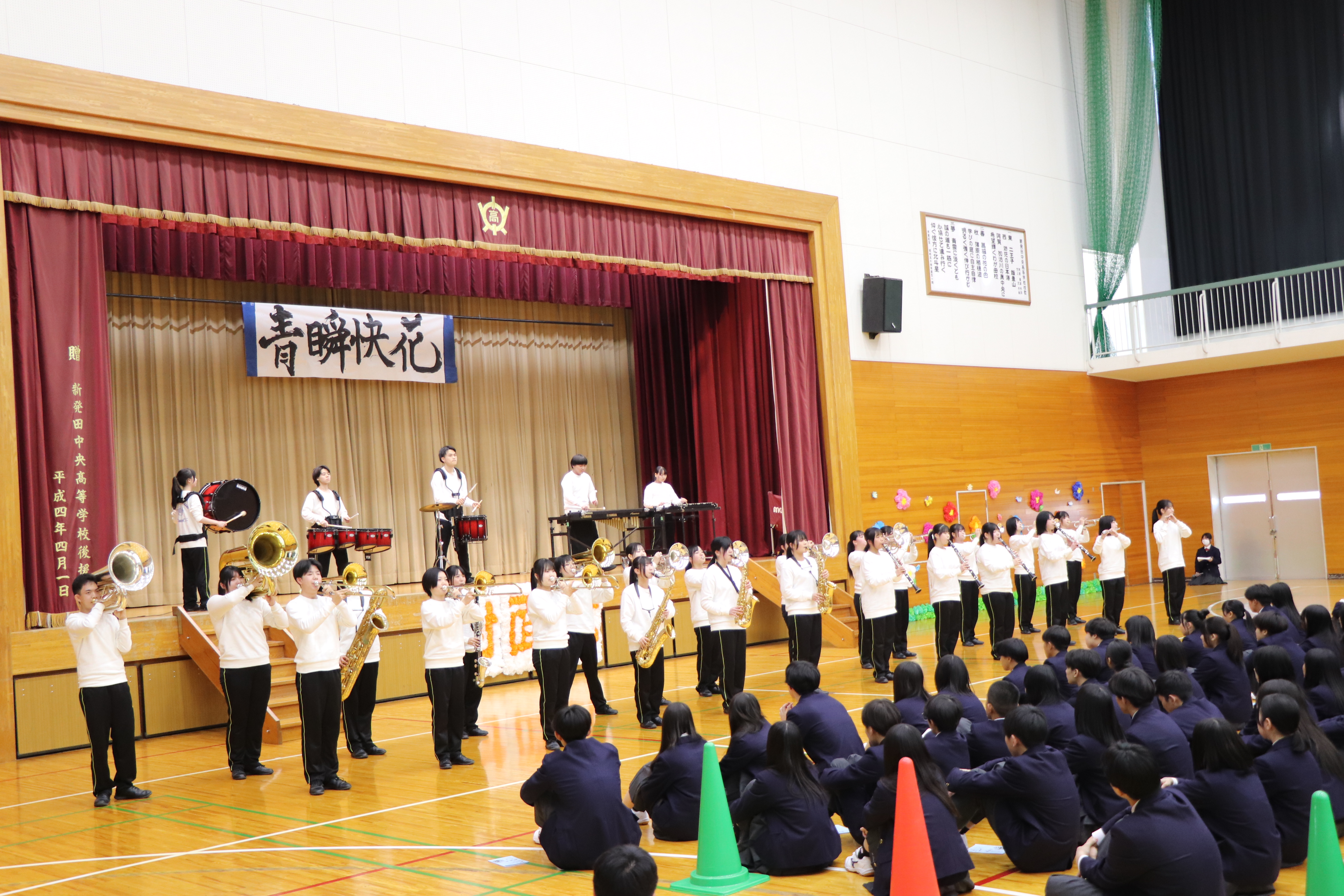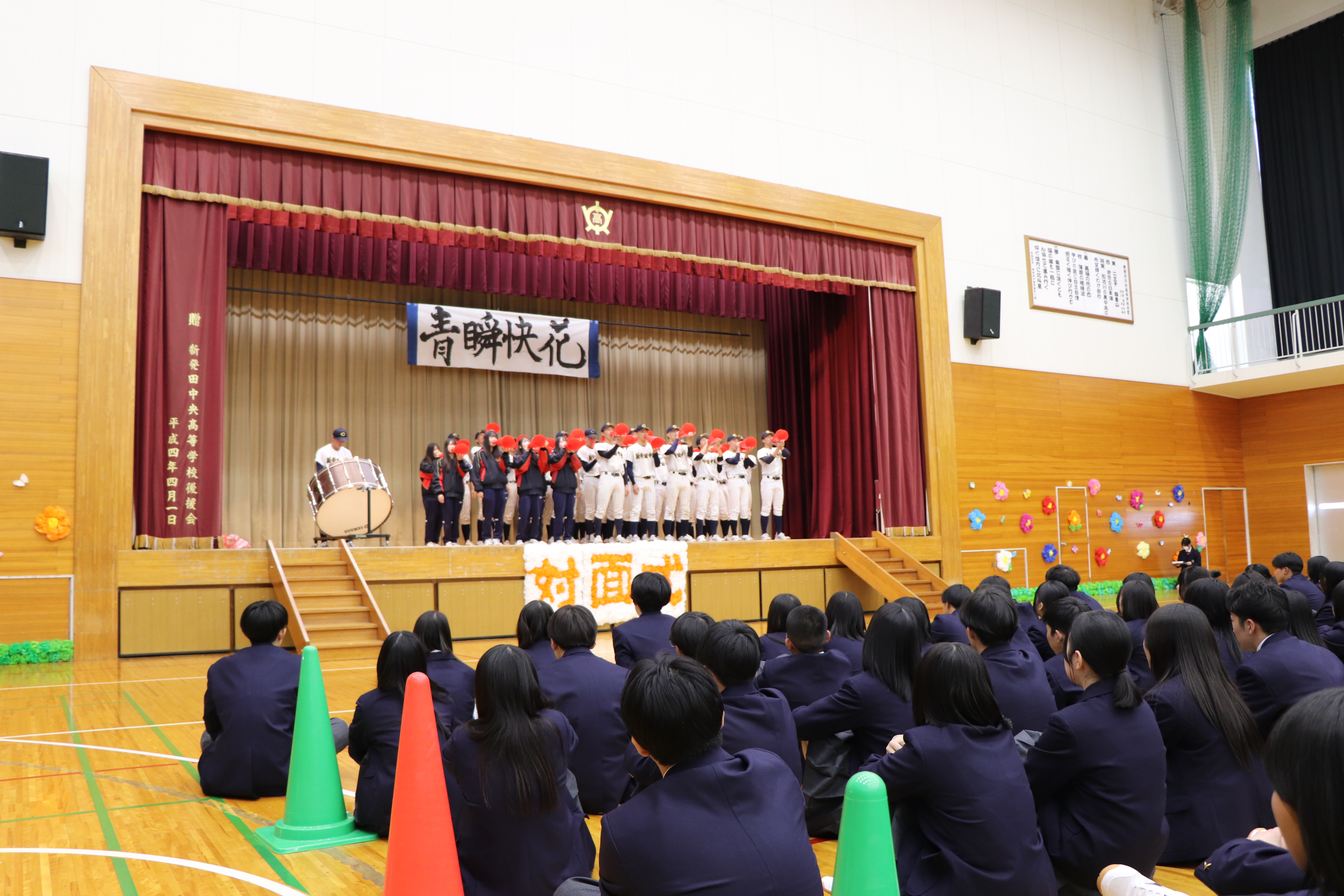 期待と不安を抱いた新入生を温かい拍手で迎え、スライドによる行事紹介、インタビュー形式での1学年の先生紹介、そして工夫を凝らした部活動紹介を行いました。