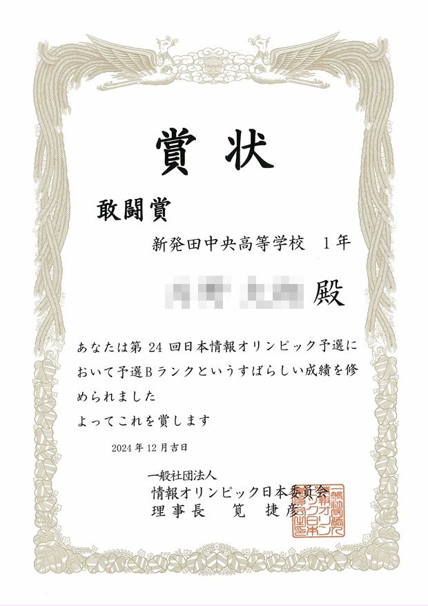 「第24回日本情報オリンピック」一次予選に参加した3名(1年生2名・2年生1名)全員が二次予選に進出し、敢闘賞をいただきました