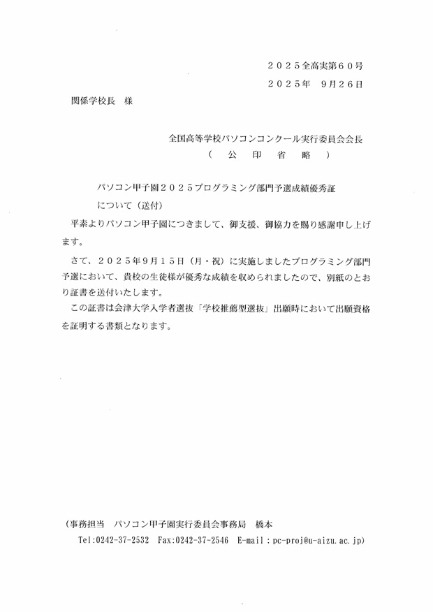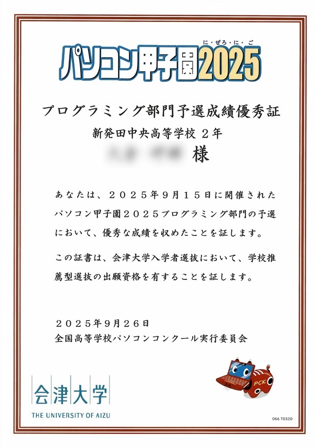 9月15日(月・祝)にパソコン甲子園2025プログラミング部門予選に参加し、今年も「プログラミング部門予選成績優秀証」をいただきました。