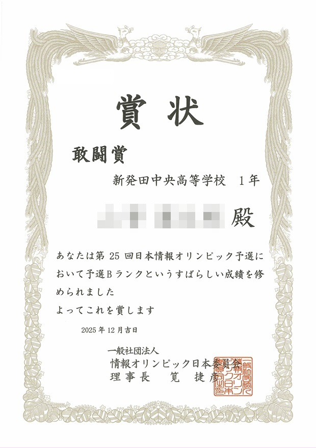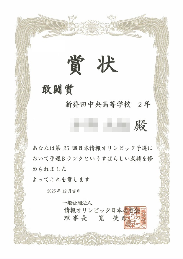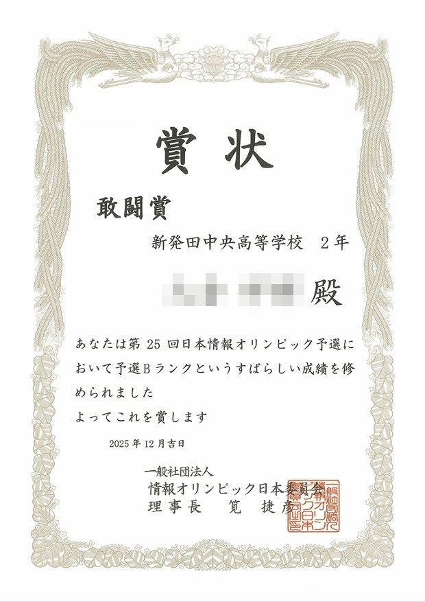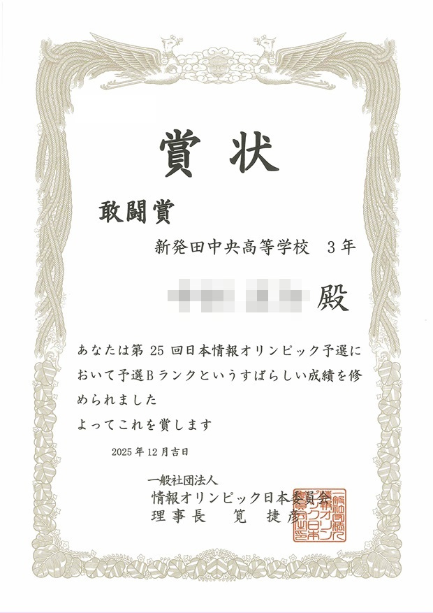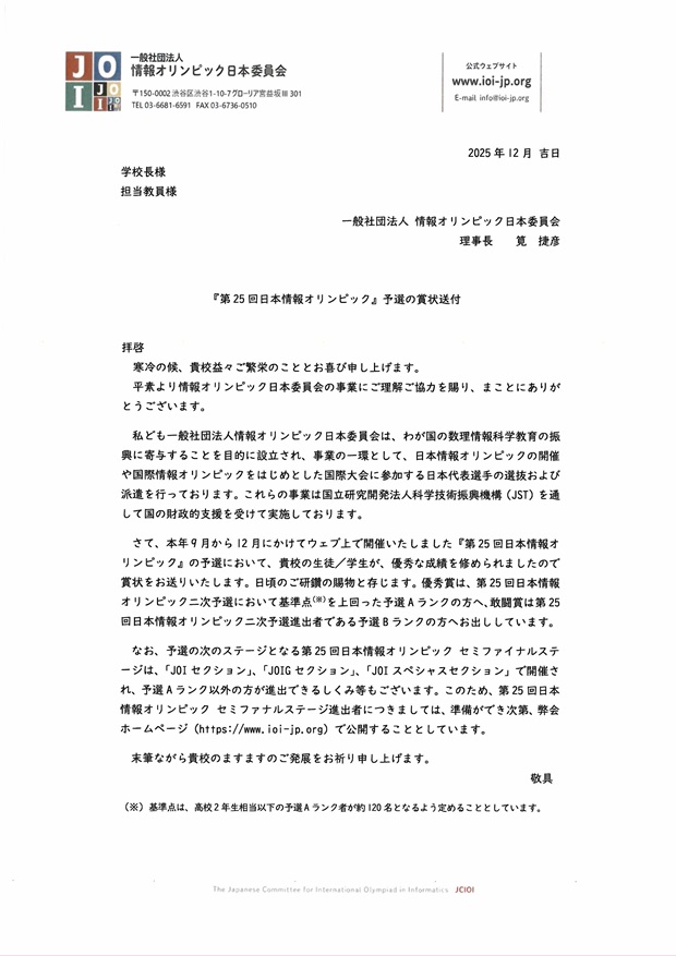 「第25回日本情報オリンピック」予選 全員敢闘賞!